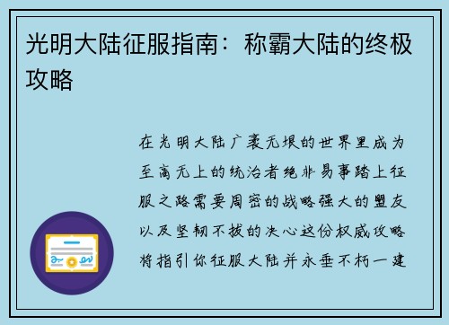 谨记,征服之路充满挑战,但凭借本指南提供的策略和建议,你将拥有统治大陆所需的知识和工具。踏上征途,写下你的传奇,成为《光明大陆》的至高无上者!