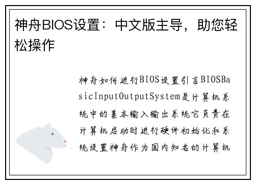 BIOS(Basic Input/Output System)是计算机系统中的基本输入输出系统,它负责在计算机启动时进行硬件初始化和系统设置。神舟作为国内知名的计算机品牌,其BIOS设置也备受关注。本文将详细介绍如何进行神舟电脑的BIOS设置,帮助用户更好地了解和操作自己的计算机。