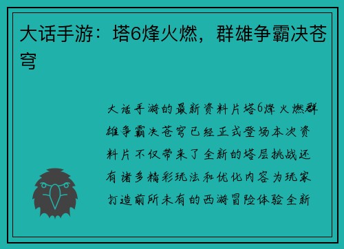 《大话手游》的最新资料片“塔6烽火燃,群雄争霸决苍穹”已经正式登场。本次资料片不仅带来了全新的塔层挑战,还有诸多精彩玩法和优化内容,为玩家打造前所未有的西游冒险体验。