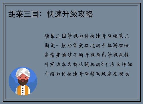 胡莱三国是一款非常受欢迎的手机游戏,玩家需要通过不断升级角色等级来提升实力。本文将从随机的8个方面详细介绍如何快速升级,帮助玩家在游戏中取得更好的成绩。